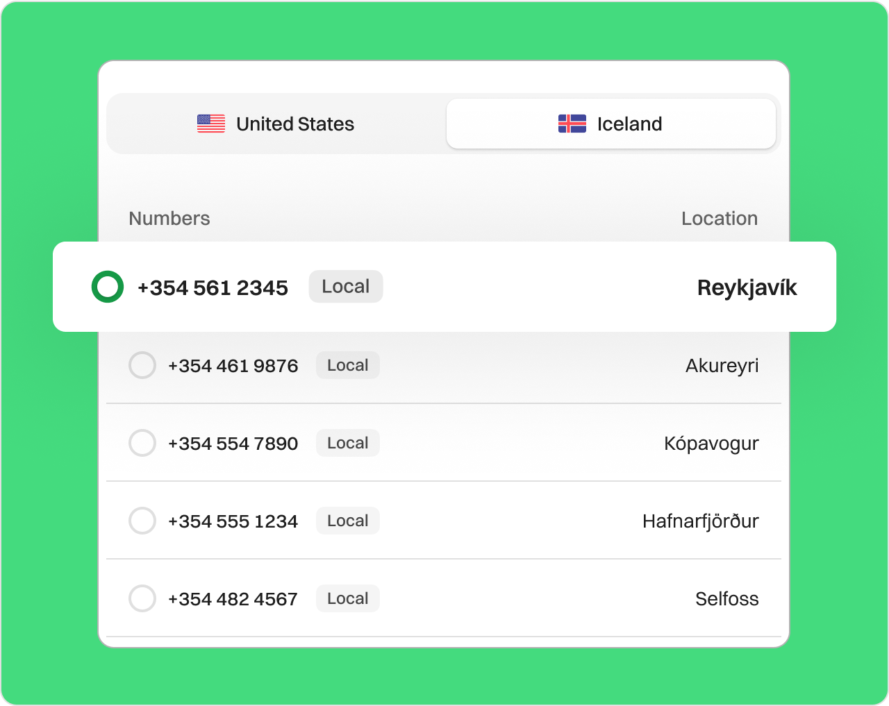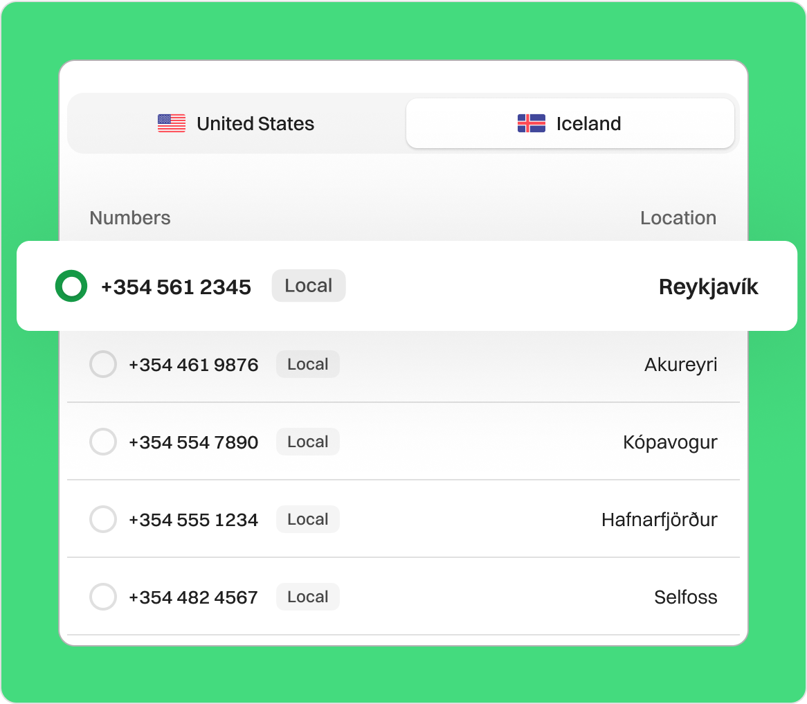 Unlock local calls with an Iceland virtual number. Select your country and region, and pick a number that suits your needs. You can even effortlessly get a vanity number or multiple numbers.